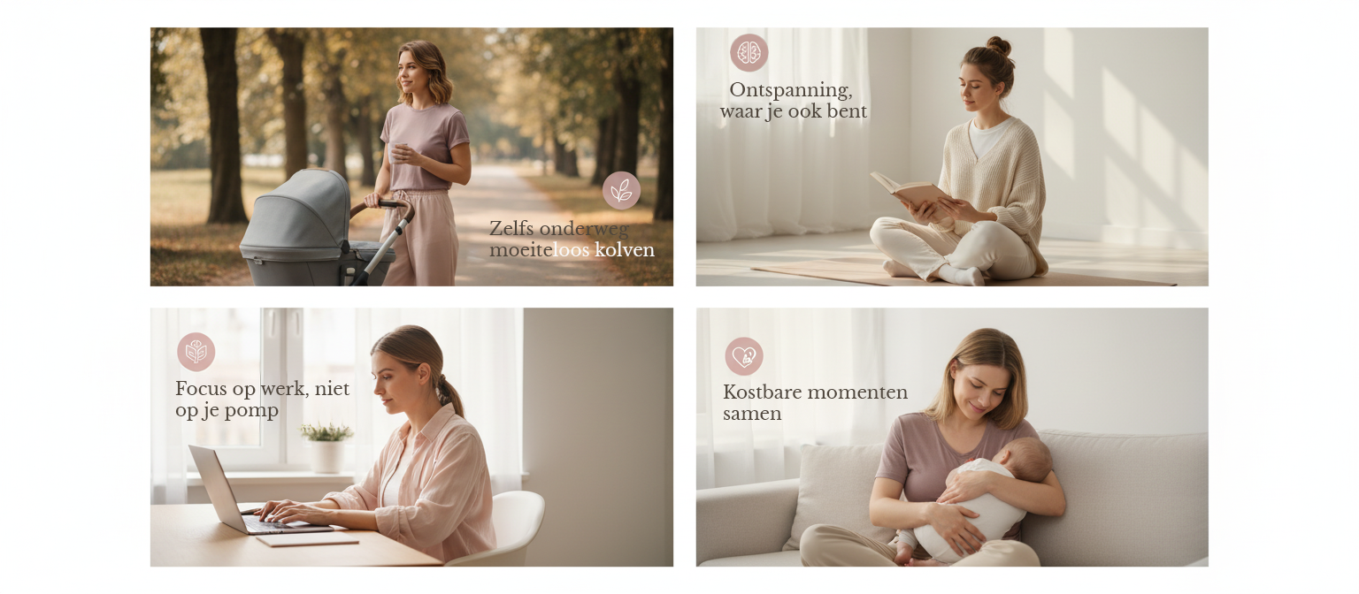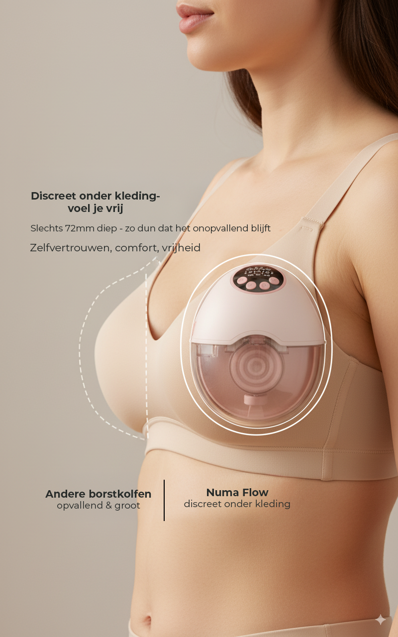 Dankzij de compacte vorm past de Numa Flow comfortabel in je beha. Je kolft discreet en handsfree, terwijl je doorwerkt, ontspant of geniet van een moment met je baby. Met een fluisterstil geluidsniveau (<45 dB) blijft je omgeving ongestoord – zelfs ’s nachts of tijdens dutjes.