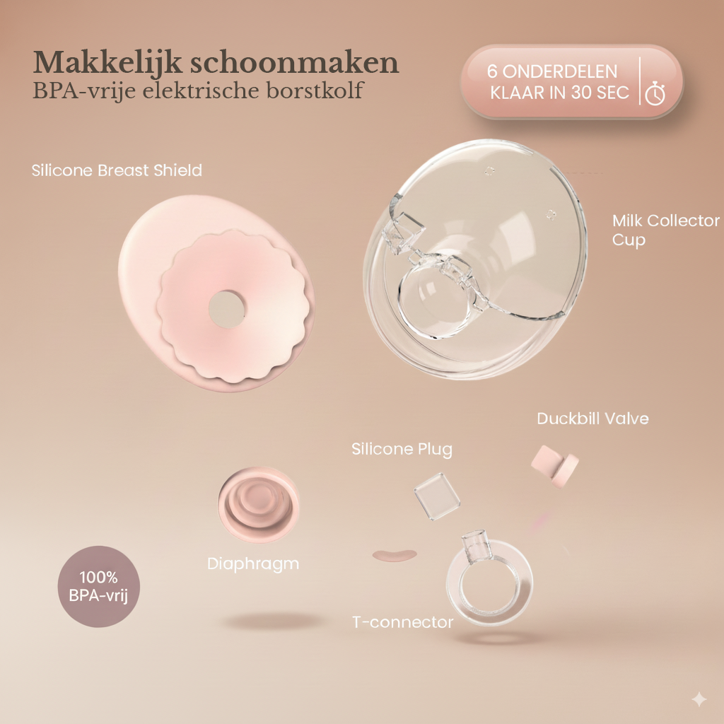 De borstkolf is gemaakt van voedselveilige siliconen en volledig BPA-vrij. Het slimme split-design zorgt dat elk onderdeel eenvoudig los te maken en schoon te spoelen is. Antiterugstroom-technologie voorkomt lekkage en houdt melk altijd hygiënisch.